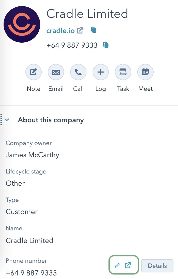 By clicking on the box next to phone numbers in the contact information panel, you can call straight out of Cradle. You can also click on phone numbers in any of the call engagements that Cradle posts to the activity timeline.