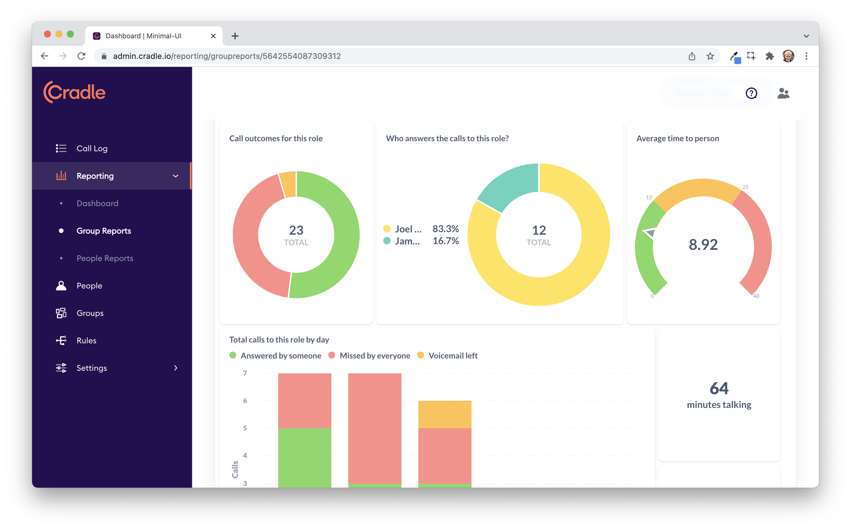 This tile represents how many calls have come into the Group over the selected date range, and what happened to them. You have answered by someone, missed by everyone and then voicemail (if the call was missed but the caller left a voicemail).