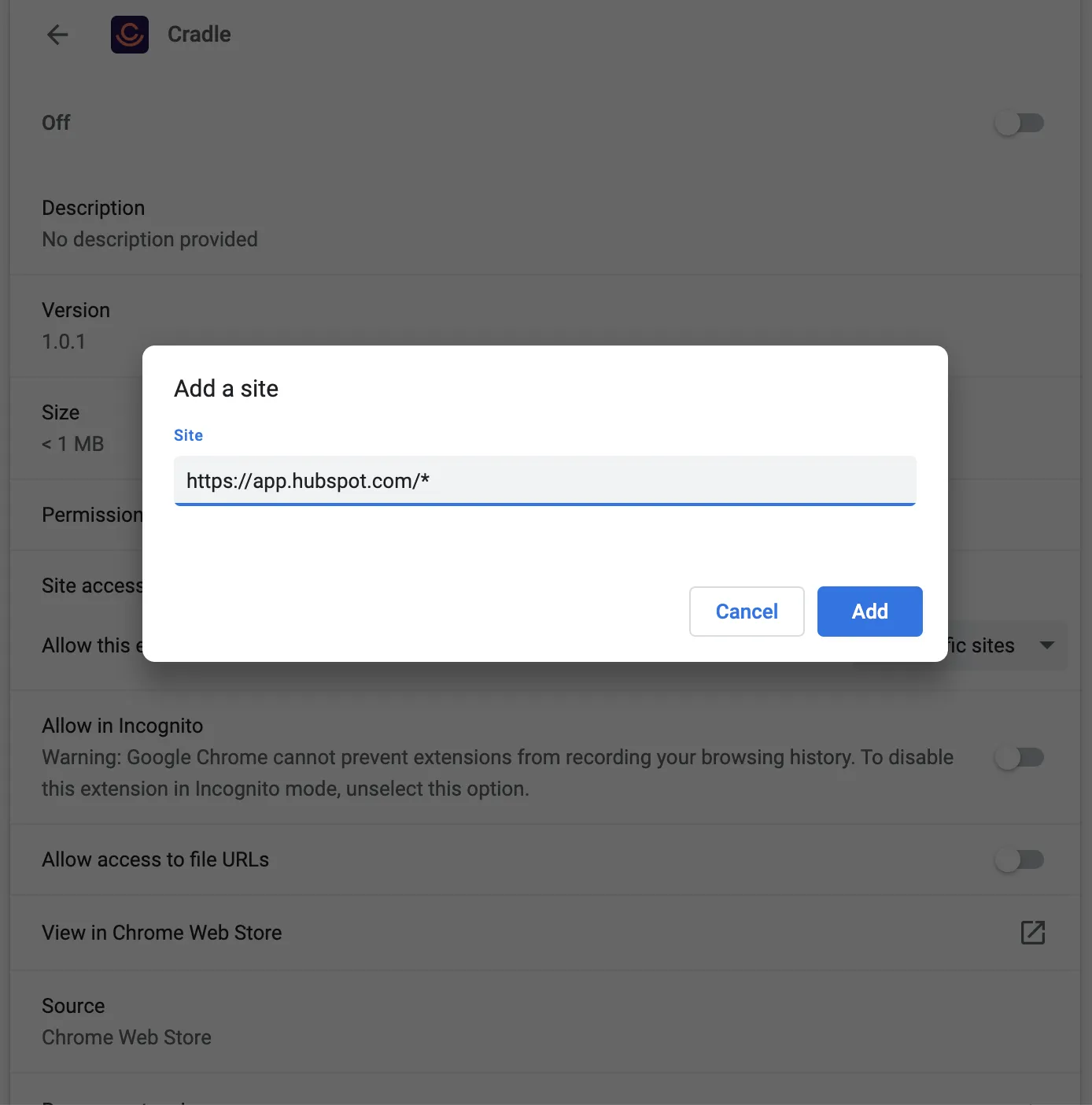 - In the box that appears enter the URL of your CRM with a wildcard (*) at the end. So for HubSpot you would enter https://app.hubspot.com/*.