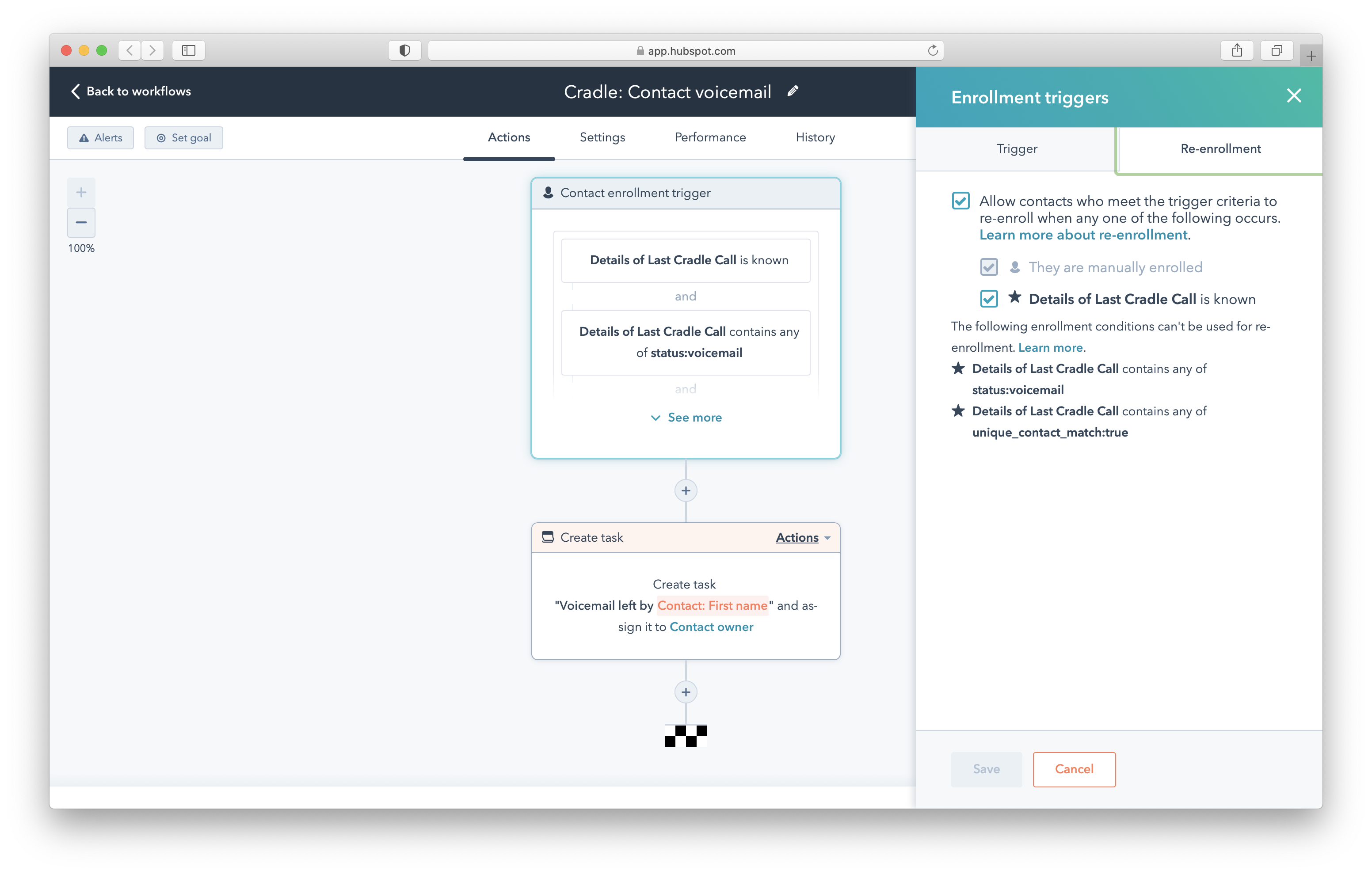 Ensure that you end the workflow with a Clear property value step and clear the Details of Last Cradle Call contact property to make sure that contacts get re-enrolled in this workflow if they leave another voicemail before you've called them back.